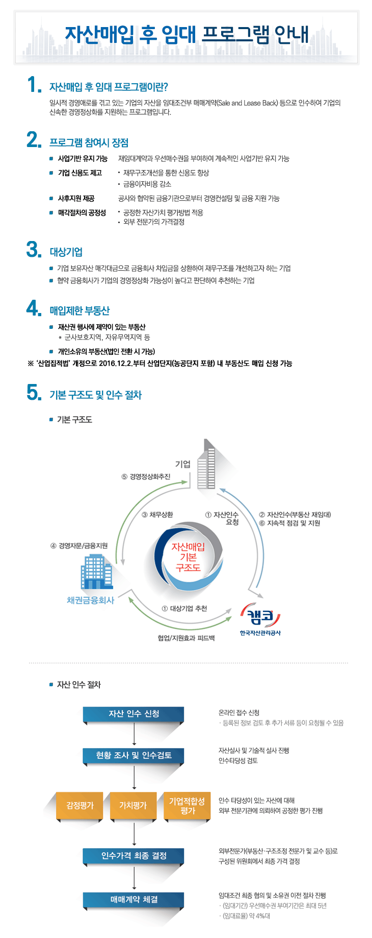 - 캠코에서 경영난을 겪고 있는 기업을 대상으로 자산매입 후 임대(세일즈 앤 리스 백) 프로그램을 운영 중이오니 참고하시기 바랍니다.
